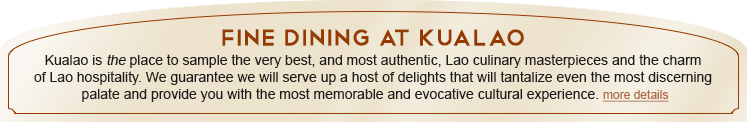 | Kualao is not just a paragon of Vientiane hospitality, but is also a charming example of French colonial architecture and a treasury of the finest, authentic Lao cuisine. more details |